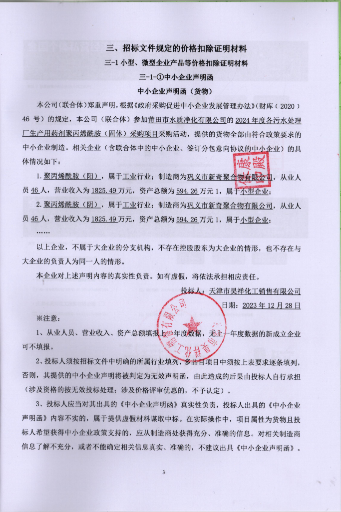 二、项目名称:2024年度各污水处理厂生产用药剂聚丙烯酰胺(固体)采购项目