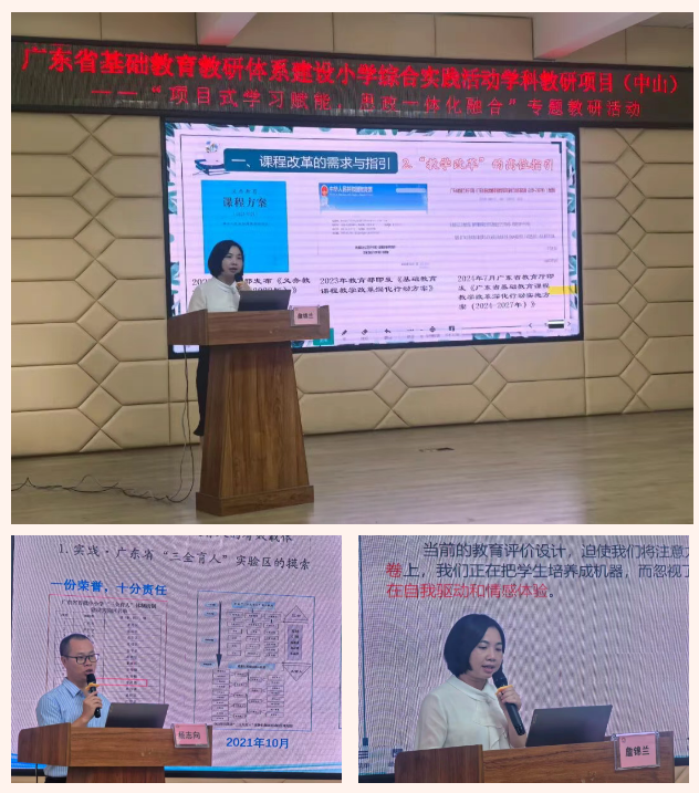 ************学校提供了可复制、可推广的实践范本。东凤镇教体中心杨志向作《探究·统整·生成,项目化驱动区域思政育人路径探索》专题发言,提出以“探究”寻求思政育人新载体,以“统整”构建知行合一教学体系,以“生成”推动核心素养内化赋能,为区域“实践+思政”融合提供了可操作的实施路径。